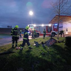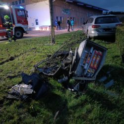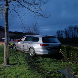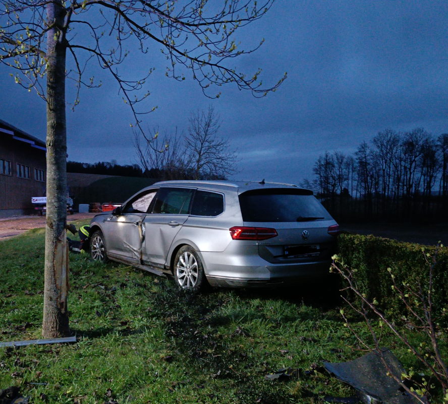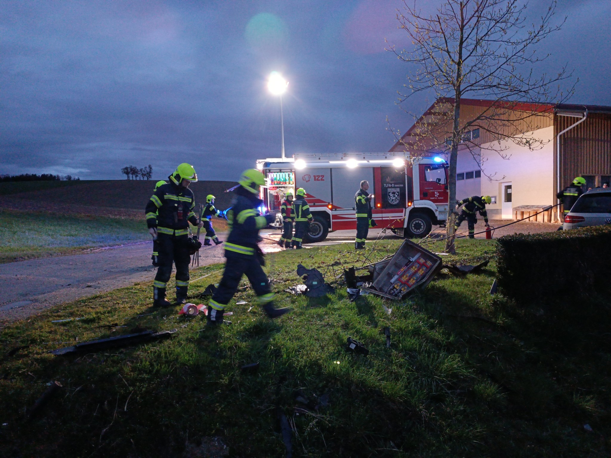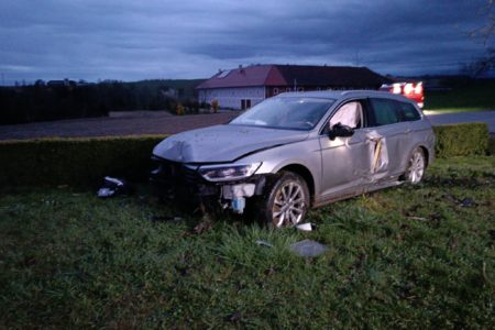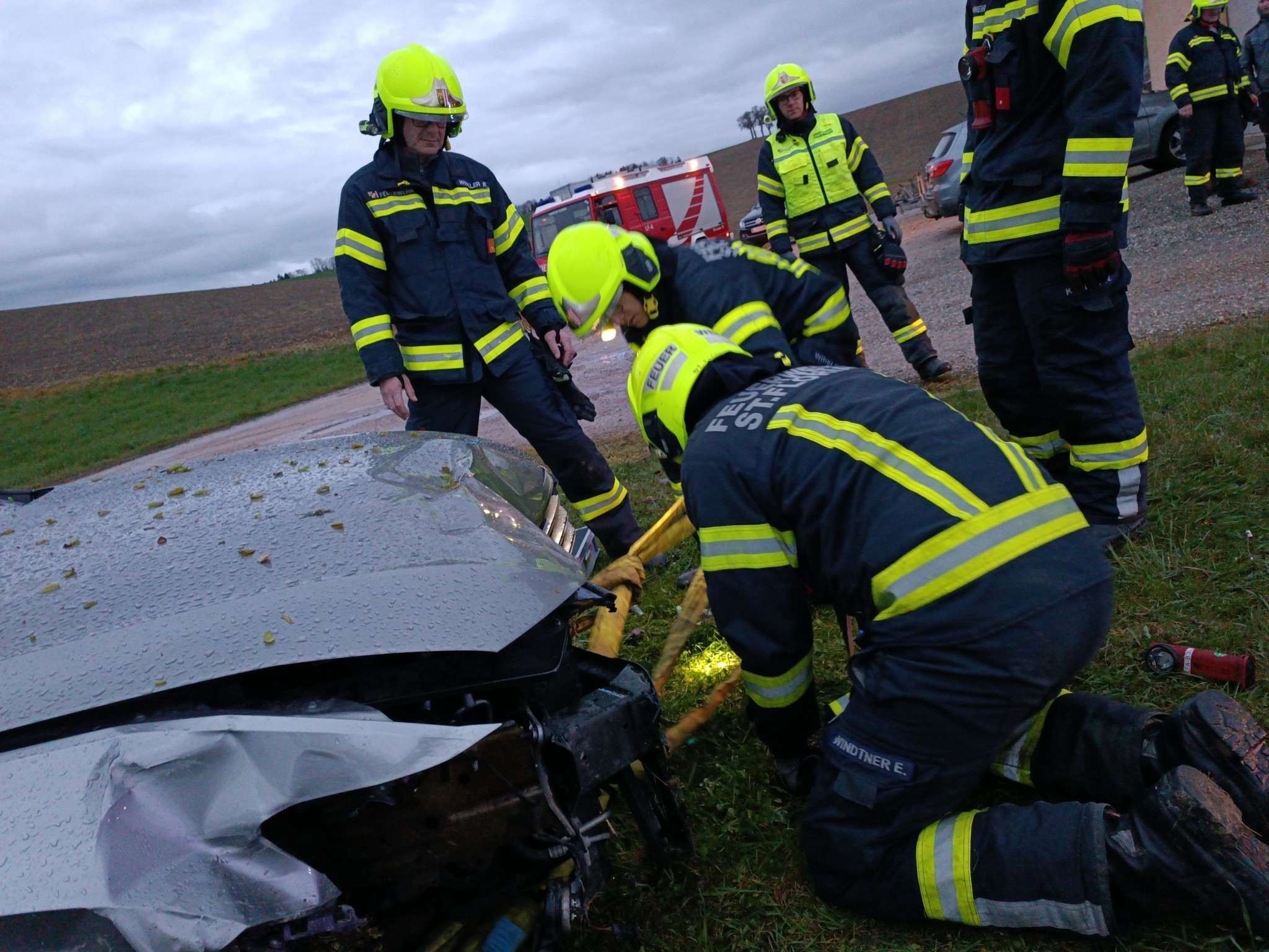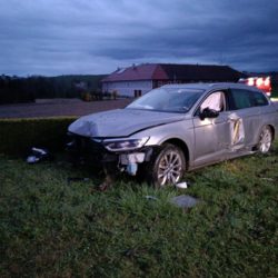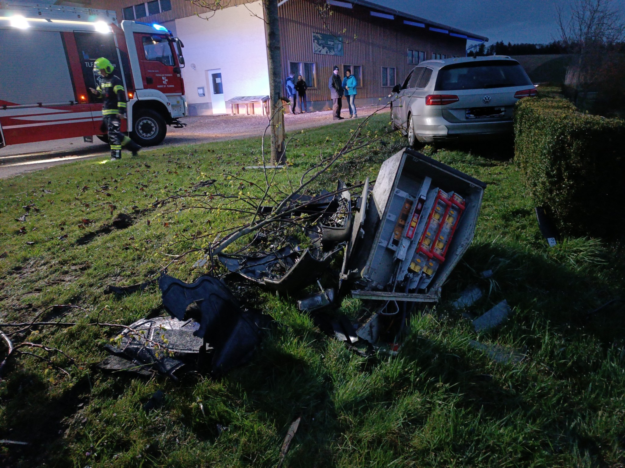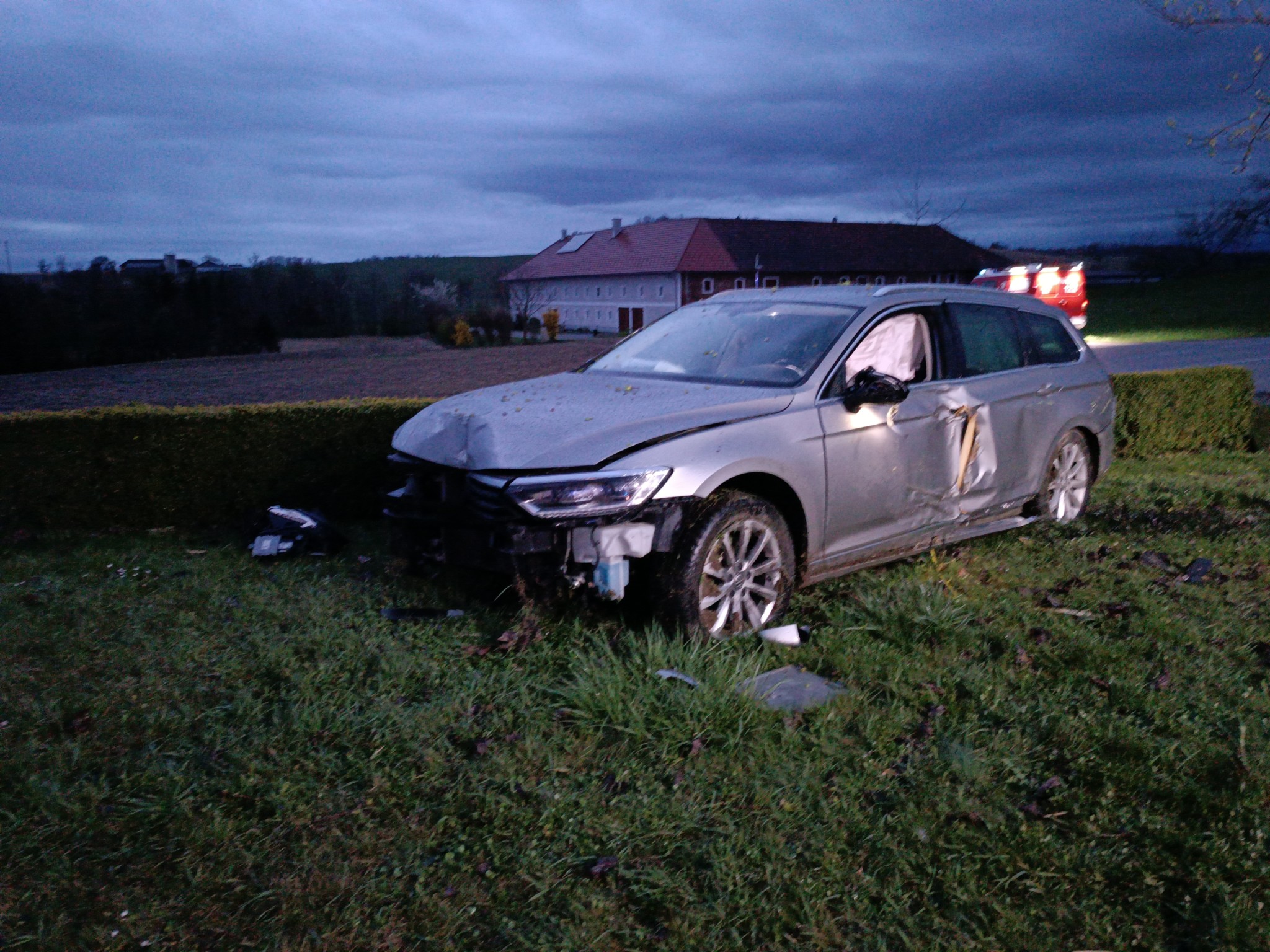 Auf der L1374 von St. Marien kommend kam ein Fahrzeug von der Straße ab, schlitterte durch den Straßengraben, überfuhr einen Stromverteilerkasten und touchierte einen Baum. Letztendlich kam das schwer beschädigte Fahrzeug auf einer Wiese von einem Firmengelände zu stehen.