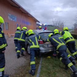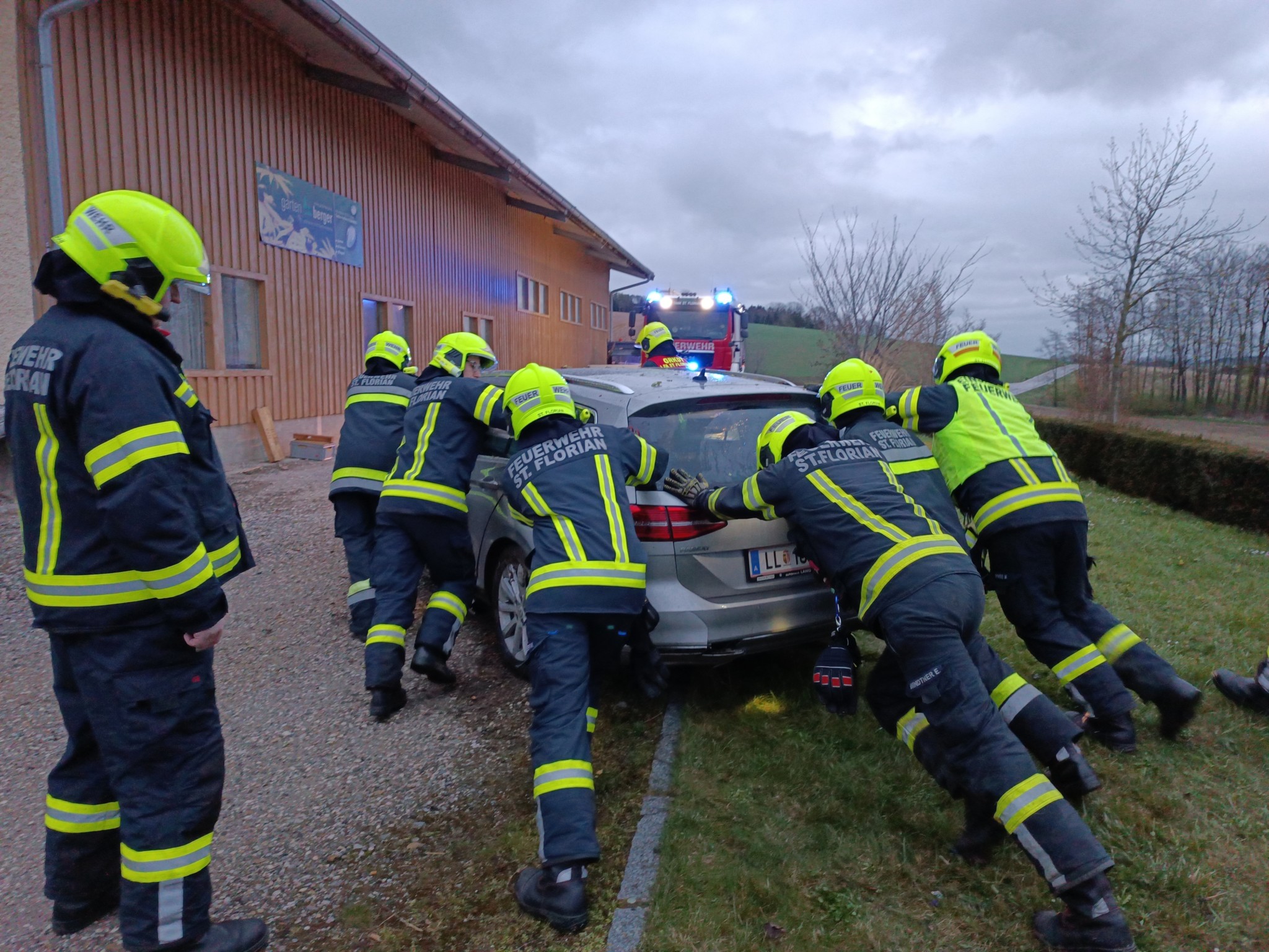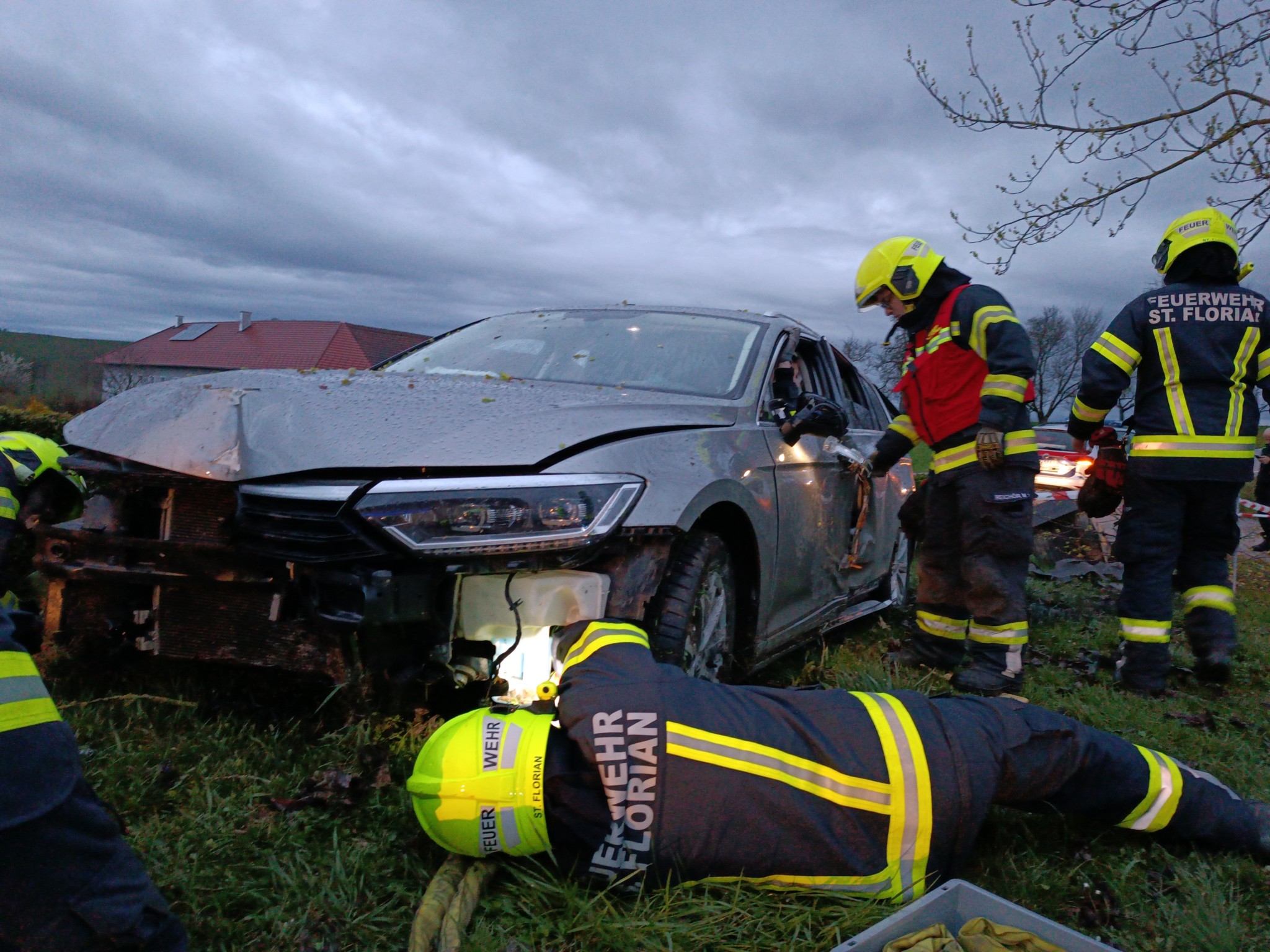 Der Lenker konnte sich selbständig aus dem verunfallten Fahrzeug befreien. Die FF St. Florian sperrte den Bereich um den Stromverteilerkasten ab und verständigte unverzüglich die Netz OÖ GmbH. Mit Hilfe der Seilwinde des TLFA-B und Muskelkraft wurde das Fahrzeug aus der Wiese befreit, sodass der Abschleppdienst das Fahrzeug entsprechend aufnehmen kann. Austretende Flüssigkeiten wurden aufgefangen.