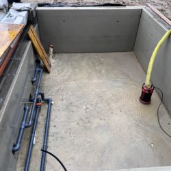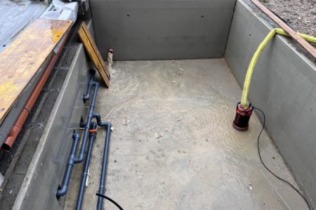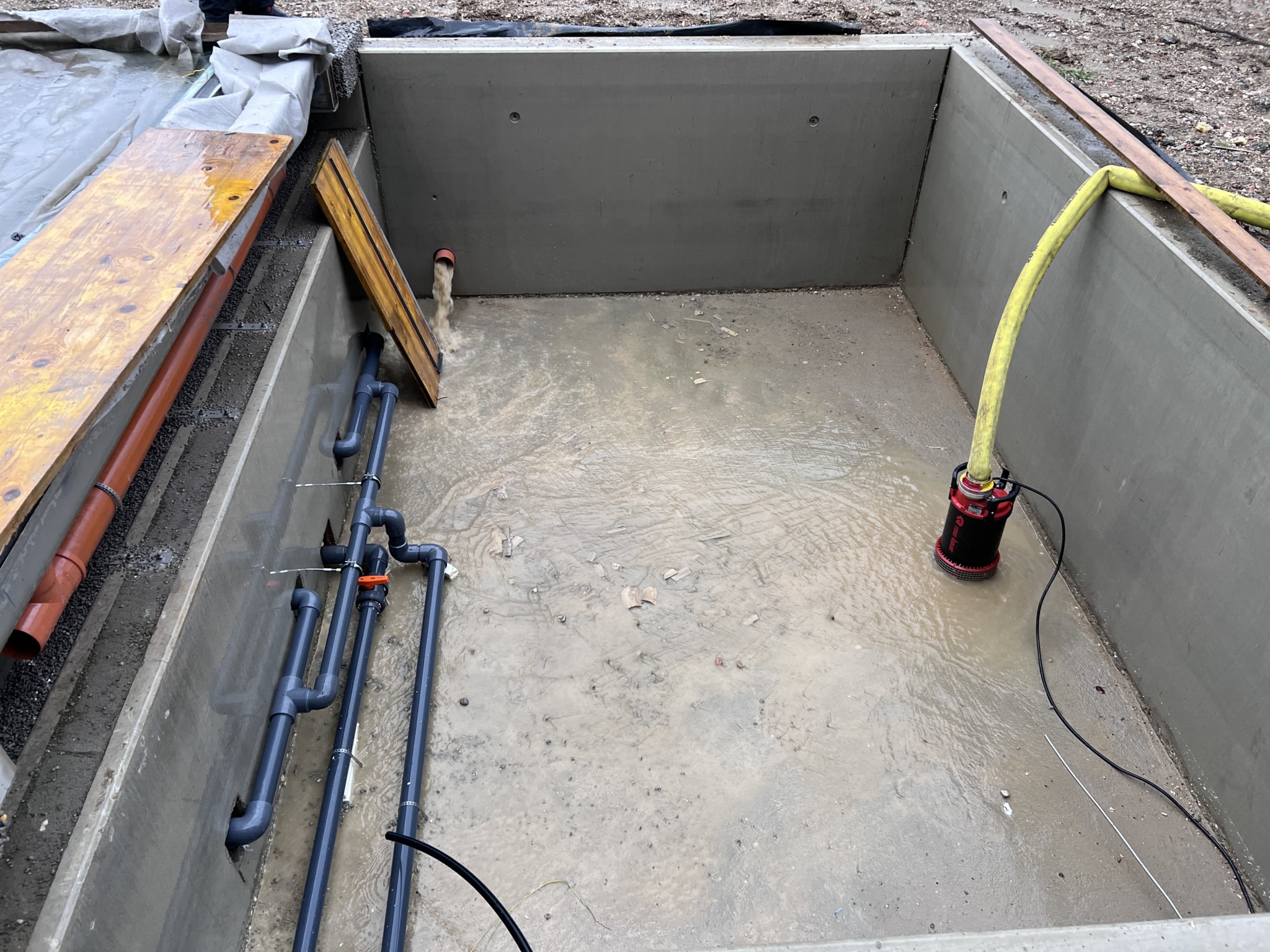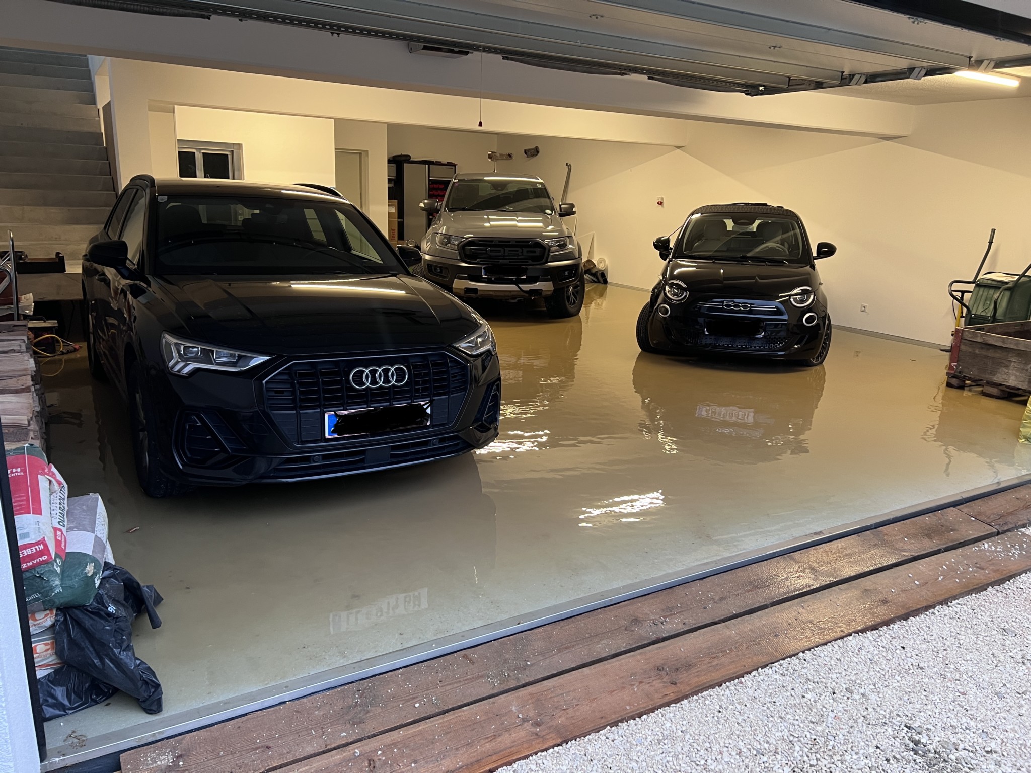 Über die Pooltechnik, welche gerade aufgebaut wurde, bahnte sich das Wasser den Weg in die Garage und den Keller. Der Keller stand mit ca. 10cm unter Wasser. Mittels Pumpen, Wassersaugern und Wasserschiebern wurde das Wasser aus dem Gebäude entfernt. Ein Rohr wurde provisorisch abgedichtet.
