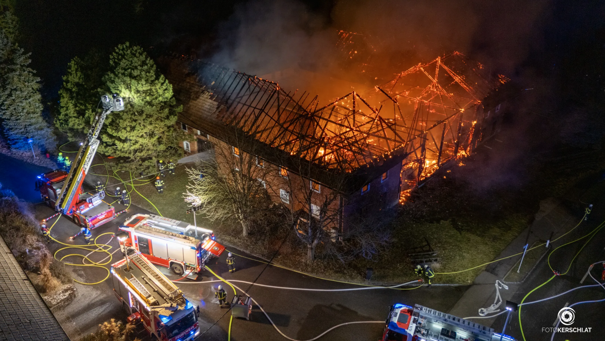 Bereits bei der Anfahrt der Einsatzkräfte wurde auf Alarmstufe 2 erhöht. Der in der Silvesternacht herrschende starke Wind führte zu einer raschen Ausbreitung des Brandes, wodurch der Brand innerhalb kürzester Zeit den gesamten Wirtschaftstrakt erfasste.