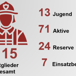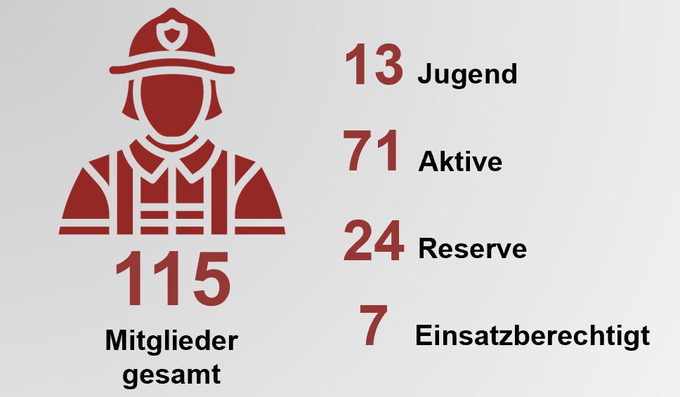 - Mitgliederstand zum Stichtag 01.01.2026 115 Mitglieder (13 Jugend, 71 Aktive, 24 Reserve, 7 Einsatzberechtigte)
