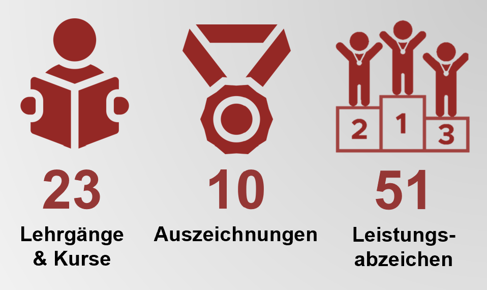 - 23 besuchte Lehrgänge & Kurse, 10 Auszeichnungen, 51 abgelegte Leistungsabzeichen im Jahr 2025