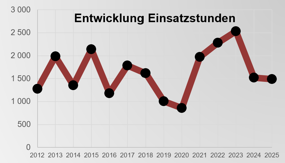 Somit setzt sich der Trend der letzten Jahre fort, dass nur mehr 30% der Einsätze Brandeinsätze sind und 70% entfallen auf Einsätze technischer Natur. - ca. 1.500 Einsatzstunden in 2025