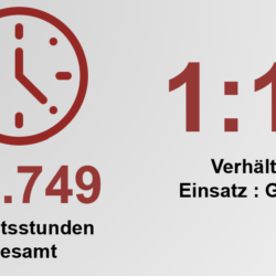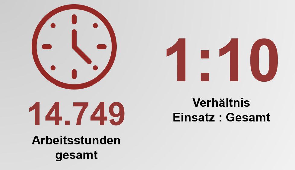Mit 14.749 Stunden insgesamt blicken wir auf ein arbeitsintensives Jahr zurück. Würde man für die geleisteten Stunden einen Stundensatz von € 80 ansetzen, würden sich Personalkosten in Höhe von ca. € 1,2 Mio. ergeben. Das Ehrenamt ist hier nicht nur sprichwörtlich, sondern wortwörtlich unbezahlbar. - Verhältnis Einsatzstunden : Gesamtstunden (1:10)