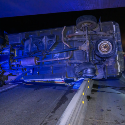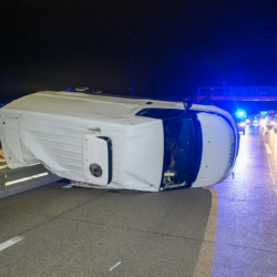 Aus unbekannter Ursache kam das Fahrzeug im Baustellenbereich von der Fahrspur ab, fuhr auf eine Fahrzeugbegrenzung auf und kippte anschließend um. Das Fahrzeug kam quer über die Fahrbahn liegend zum Stillstand. Nachkommende Fahrzeuge konnten glücklicherweise rechtzeitig bremsen.