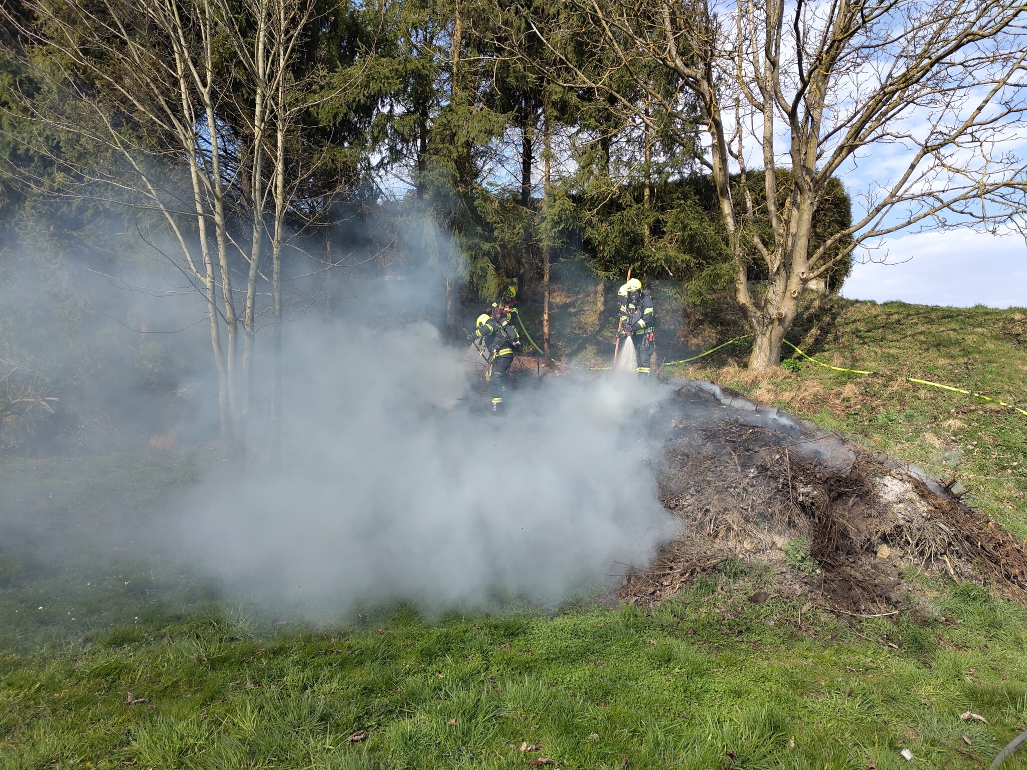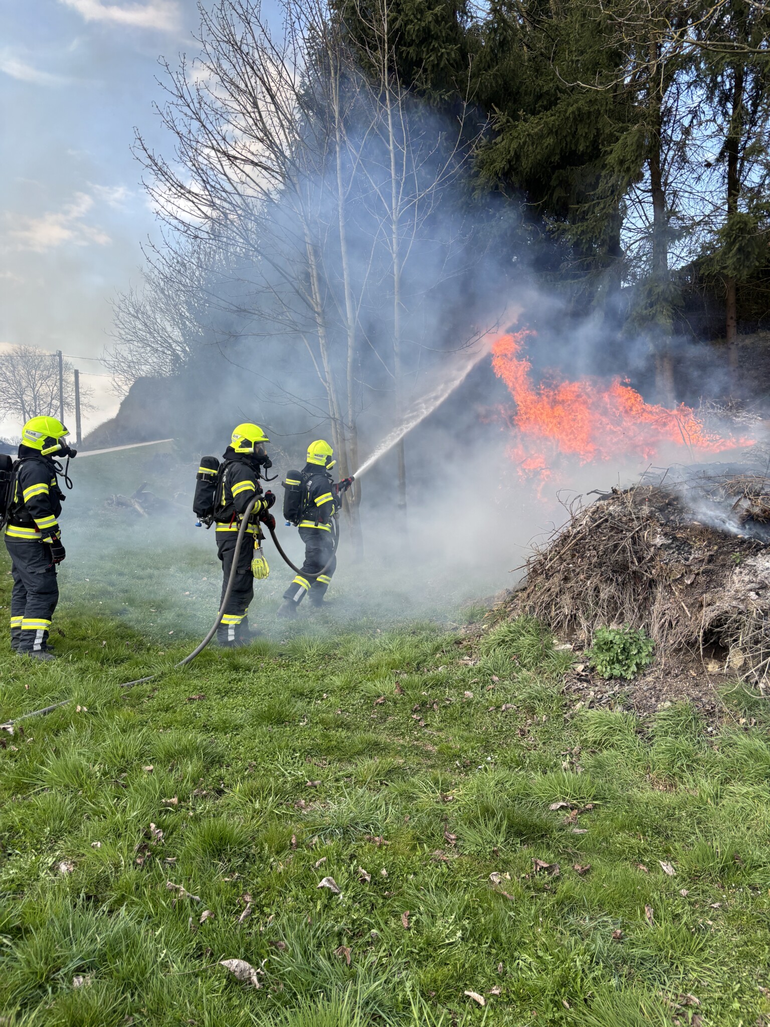 Vor Ort stellte sich heraus, dass ca. 50 m² Strauchschnitt und Kompost in Vollbrand standen. Dieser Brand war im Begriff auf die angrenzenden Bäume überzugreifen.