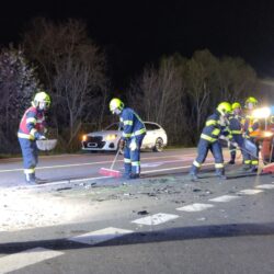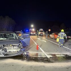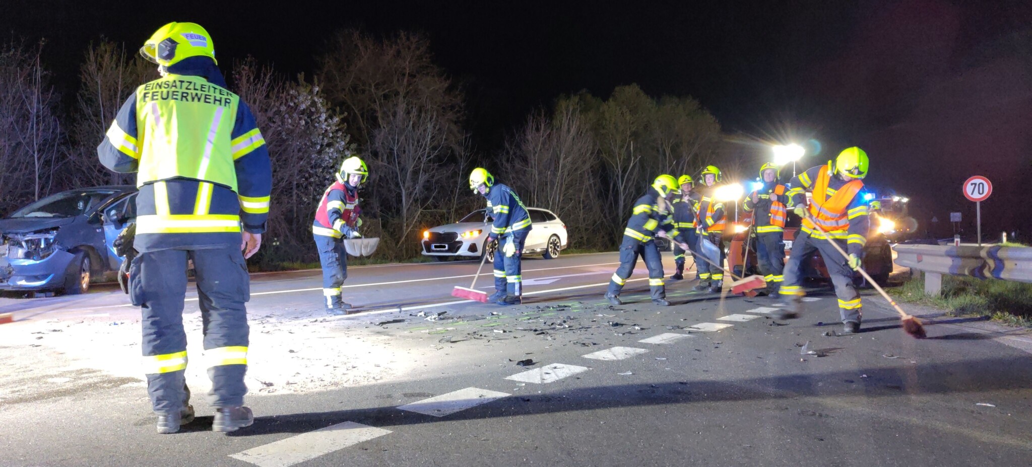 Vor Ort hatte neben dem Absichern der Unfallstelle, die Betreuung der insgesamt vier verletzten Personen oberste Priorität. Als diese dem eintreffenden Rettungsdienst übergeben werden konnten, galt es die ausgelaufenen Betriebsmittel von der Fahrbahn zu entfernen und die PKWs abschleppen zu lassen, um die Straße wieder dem Verkehr freigeben zu können.