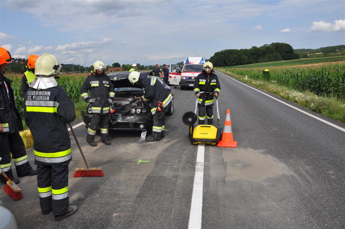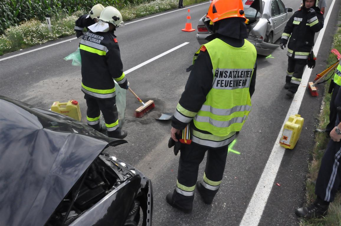 Die Tätigkeiten der Feuerwehr St. Florian beschränkten sich auf das Absichern der Unfallstelle und das Binden von ausgelaufenem Mineralöl. Im Einsatz standen 22 Mann der Feuerwehr, das KRF-A, das LF-A sowie das LAST für ca. 30 Minuten.