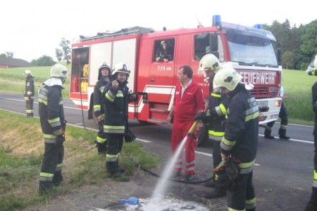 Kurz nach der Alarmierung rückte das TLF-A 2000, KRF-A 200 und das LF-A zur Einsatzstelle aus. Vor Ort wurde die Feuerwehr St. Florian bereits vom Rotem Kreuz erwartet und eingewiesen. Es stelle sich heraus, dass ein Strohhaufen neben der Straße aus unbekannter Ursache Feuer gefangen hat. Die FF St. Florian löschte den Haufen komplett ab und konnte so nach einer halben Stunde den Einsatz wieder beenden. Im Einsatz standen 37 Mann mit drei Fahrzeugen.