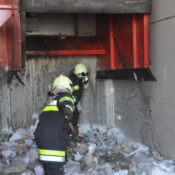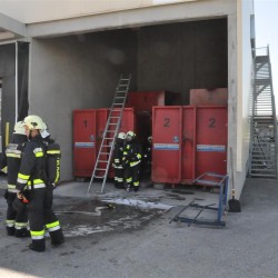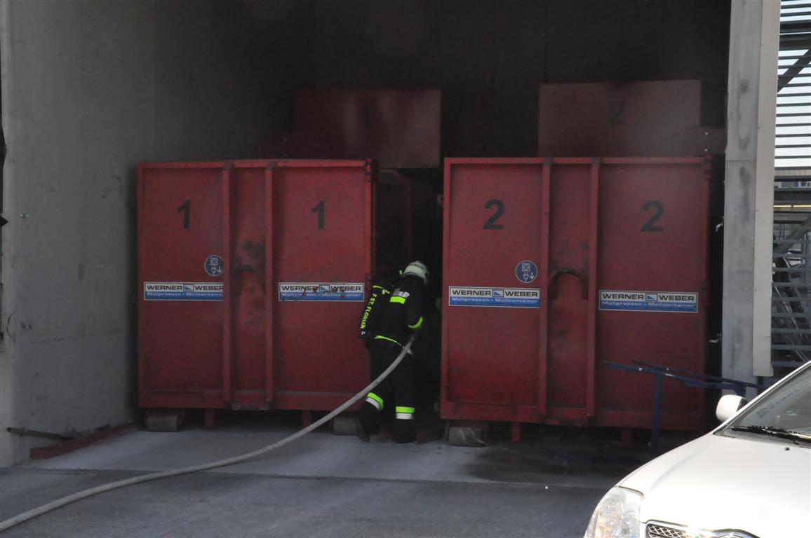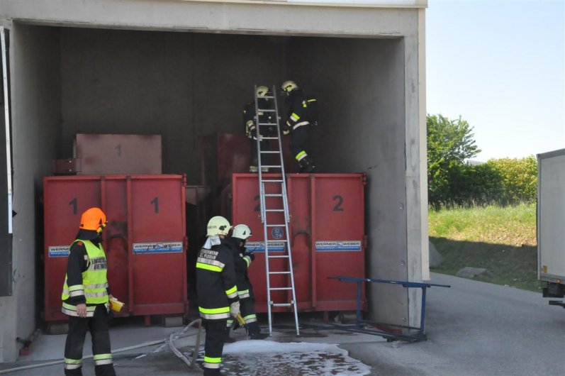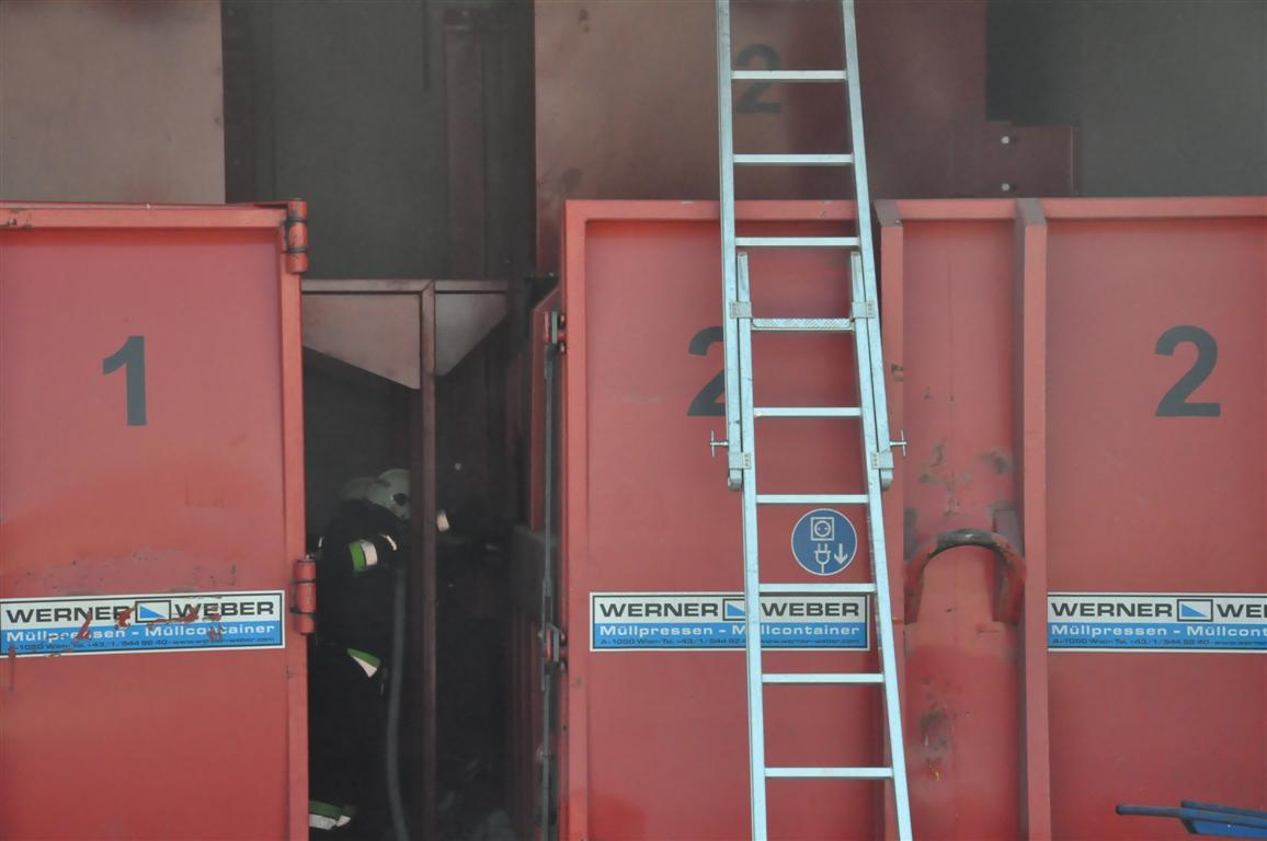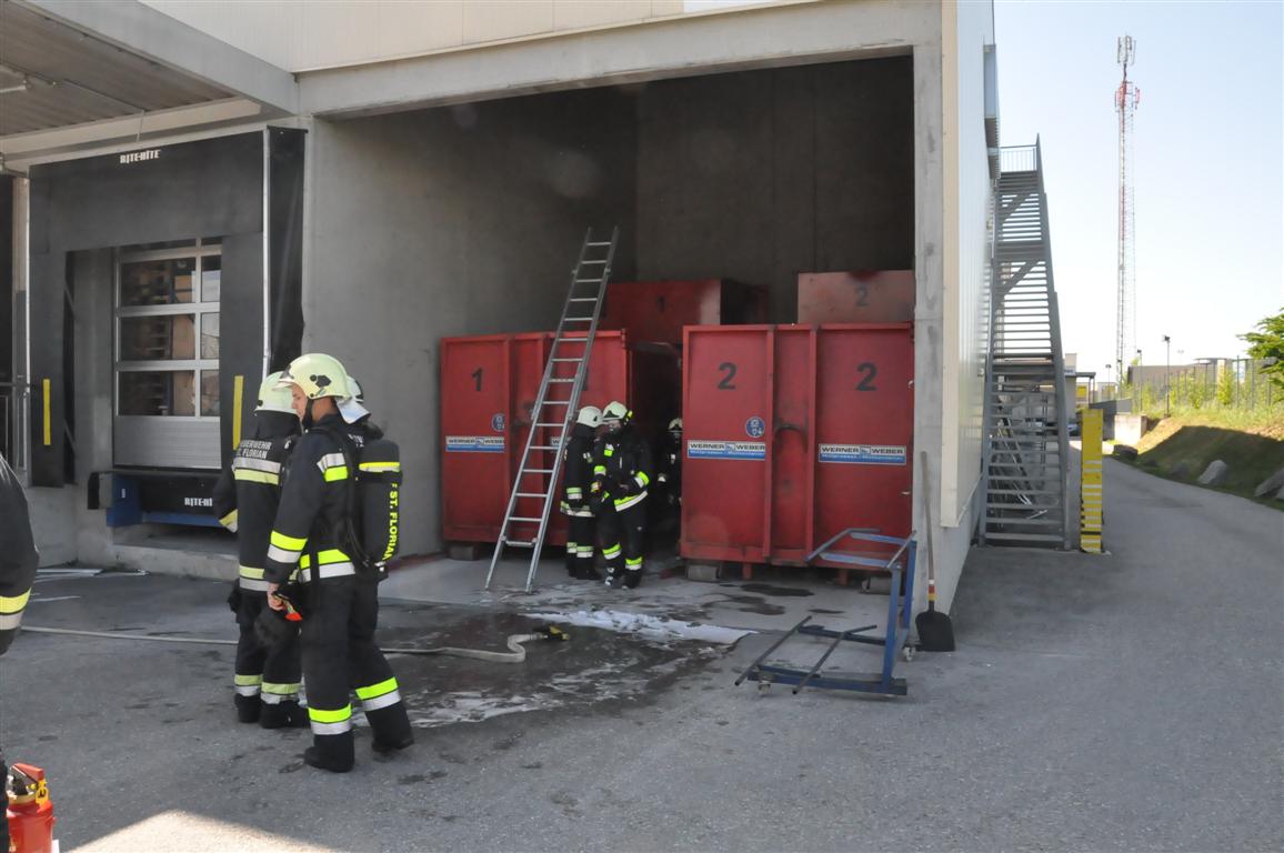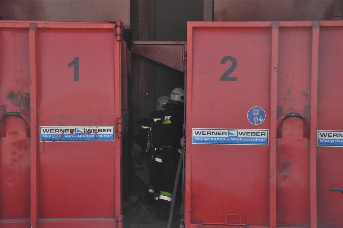 Somit wurde bereits während der Anfahrt zwei Atemschutztrupps ausgerüstet um einen schnellen Löschangriff starten zu können. Bei der Erkundung vom Einsatzleiter wurde festgestellt, dass es sich in einer Müllpresse um einen Brand handelte. Vom Atemschutztrupp der FF St. Florian wurde sofort beim Eintreffen ein HD-Rohr mit der Zugabe von Netzmittel vorgenommen und damit der Brand bekämpft. Um sämtliche Glutnester im Müllcontainer ablöschen zu können, wurde der Container mit der Seilwinde des Tanklöschfahrzeuges herausgezogen und danach nochmals benetzt. Nach der Kontrolle mit der Wärmebildkamera konnten die Einsatzkräfte nach rund 1,5 Stunden die Einsatzbereitschaft wieder herstellen. Eine Gefahr für die Verkaufsräume der Firma bestand zu keiner Zeit des Einsatzes. Im Einsatz standen 34 Mann mit vier Fahrzeugen (KRF-A 200, TLF-A 2000, DL-K 25, LF-A).