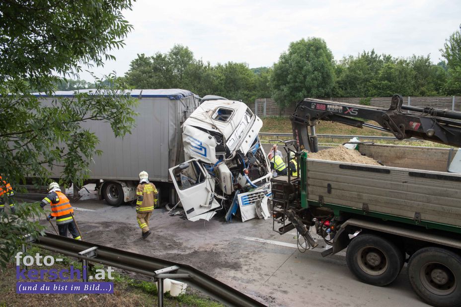 Kollidiert sind zwei Lkws Dienstagfrüh auf der Westautobahn (A1) kurz vor der Ausfahrt Ansfelden in Fahrtrichtung Salzburg.