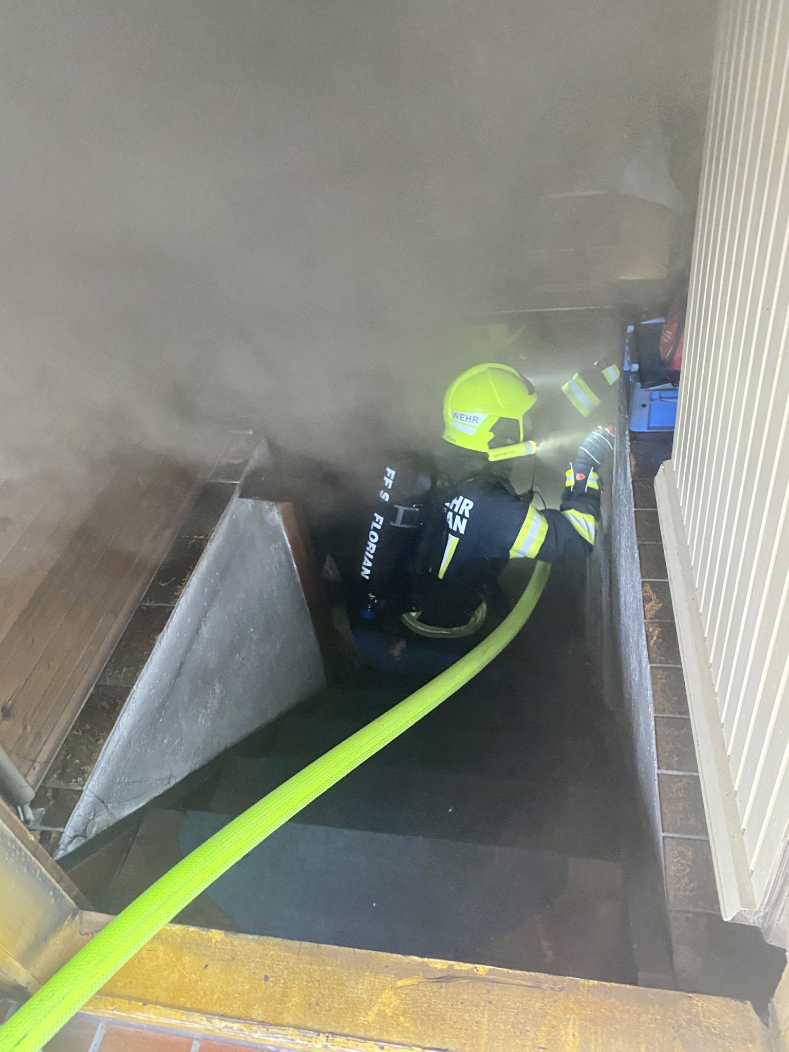 Nach kurzer Zeit rückte bereits der Löschzug der FF St. Florian in Richtung Fernbach aus. Vor Ort wurden wir bereits durch die Polizei eingewiesen und uns wurde mitgeteilt, dass sich vermutlich keine Personen mehr im Gebäude befinden. Nachdem die Zubringerleitung zum Brandobjekt mit 5 B-Längen verlegt wurde, konnte unverzüglich eine Zugangsöffnung zum Objekt geschaffen und der Brand im Kellergeschoss mit einem C-Rohr bekämpft werden. Mit Hilfe der Wärmebildkamera wurden die letzten Glutnester im Brandraum aufgespürt und entsprechende Nachlöscharbeiten durchgeführt. Anschließend wurde das Objekt noch mittels Hochleistungslüfter belüftet und rauchfrei gemacht. Die Brandursache ist Gegenstand der polizeilichen Ermittlungen. Im Einsatz standen 22 Mann der FF St. Florian mit drei Fahrzeugen (KDOA, TLFA-B 2000/200, LF-A) ca. zwei Stunden lang.